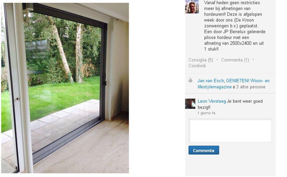 (Traduzione: “Da oggi stop alle zanzariere di dimensioni limitate! Questo prodotto mi è stato installato la scorsa settimana (dalla De Kroon zonweringen). Una zanzariera plissettata acquistata dalla JP Benelux con dimensioni di 2500×2400 in apertura unica!!”)
